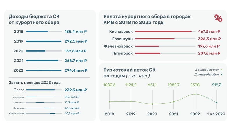 По данным минтуризма края, с января по май 2023 года ставропольские курорты собрали 239,5 млн рублей — 40% от запланированной на год суммы. Лидером по курортному сбору стал Кисловодск, получивший 80,9 млн рублей. На втором месте — Ессентуки, пополнившие краевой бюджет на 71,3 млн рублей. Пятигорск собрал 46,3 млн рублей, а Железноводск — 40,9 млн рублей.