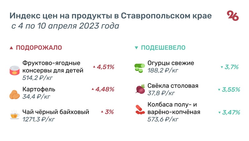 Еженедельный мониторинг изменения цен на продукты, товары и услуги от Северо-Кавказстата показал, что с 4 по 10 апреля в Ставропольском крае подорожал ряд продуктов: детский фруктово-ягодные консервы, картошка и чёрный байховый чай. Цена изменилась на 4,51%, 4,48% и 3% соответственно. Теперь 1 кг детских консервов в среднем по краю стоит 514,2 рубля, картофеля — 34,4 рубля, чёрного чая — 1271,3 рубля.
