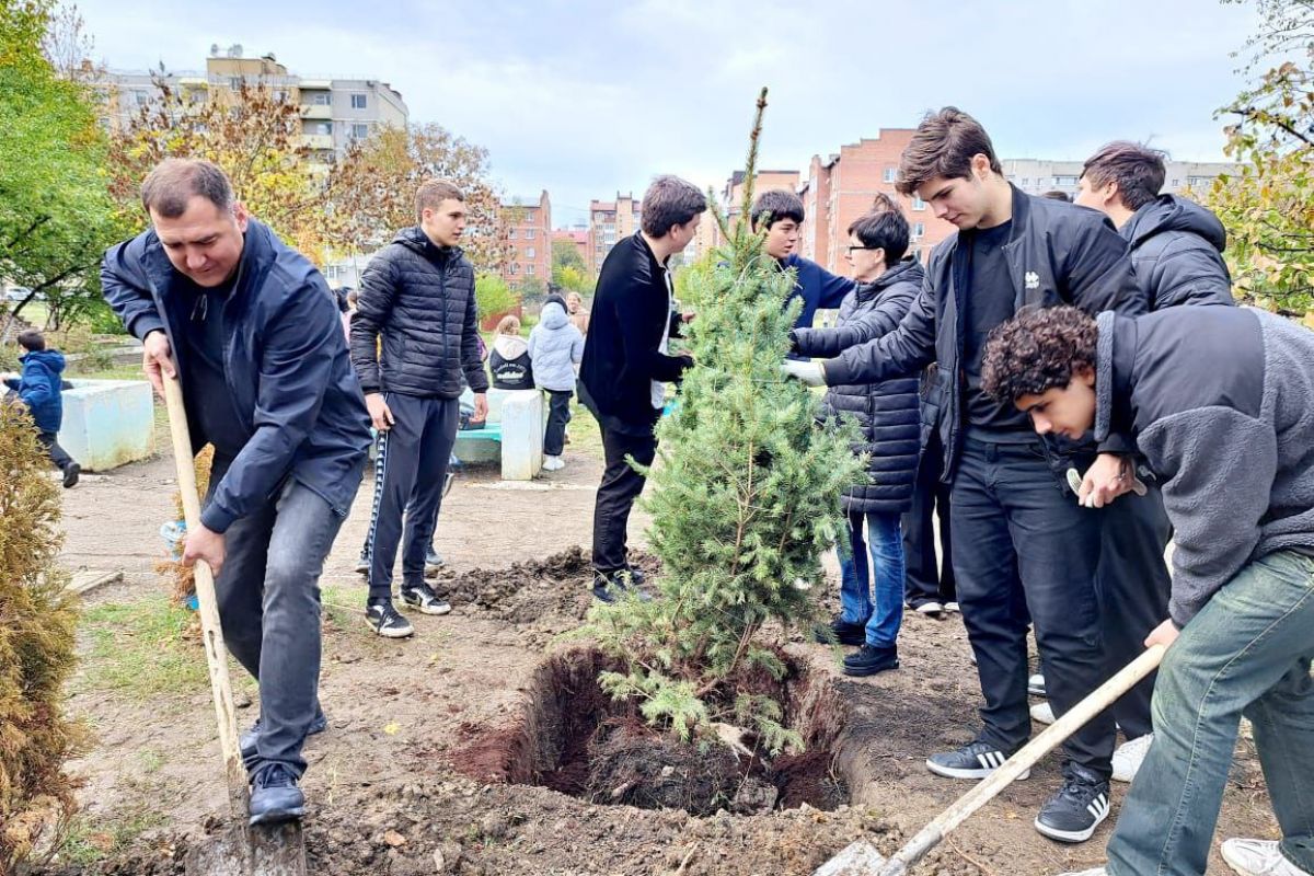 Исполняющий полномочия секретаря Минераловодского местного отделения «Единой России» Максим Гаранжа с представителями партии и школьниками высадили на территориях школ №20 г. Минеральные Воды и №14 х. Красный Пахарь молодые пушистые ели – по 25 деревьев.