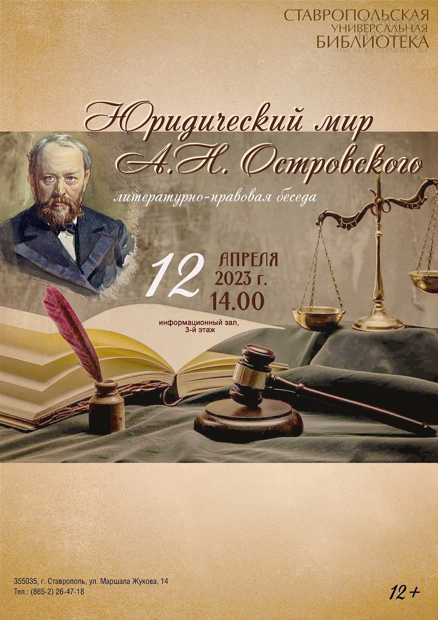 12 апреля в 14 часов в информационном зале Ставропольской краевой универсальной научной библиотеки им. М. Ю. Лермонтова пройдёт литературно-правовая беседа, посвященная творчеству создателя национального репертуара драматического театра России Александра Николаевича Островского.