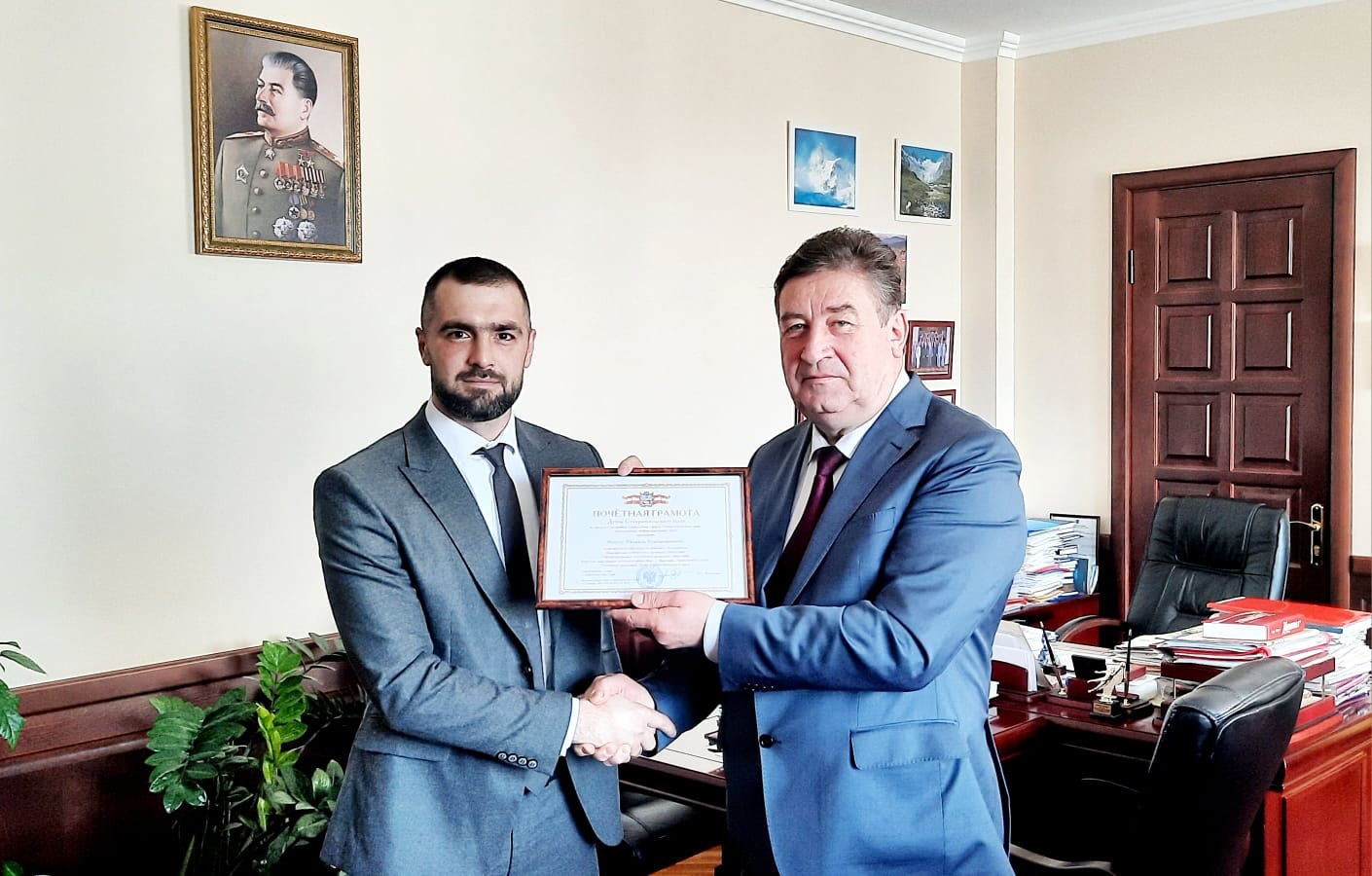 От имени депутатов Думы Ставропольского кая руководитель фракции КПРФ Виктор Гончаров вручил Михаилу Макухе почетную грамоту Думы Ставропольского края.