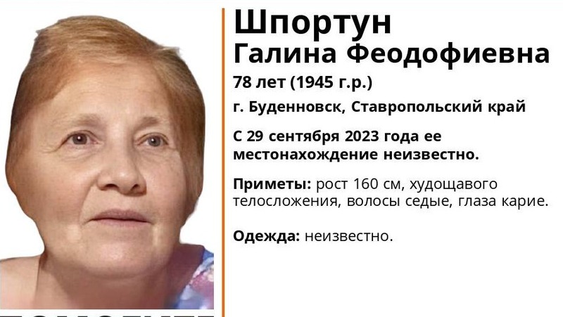 О местонахождении Галины Феодофиевны Шпортун ничего не известно с 29 сентября 2023 года. Женщине 78 лет. Она невысокого роста — 160 см — и худощавого телосложения. У пенсионерки седые волосы и карие глаза. Во что была одета Галина Феодофиевна в день исчезновения, установить не удалось.