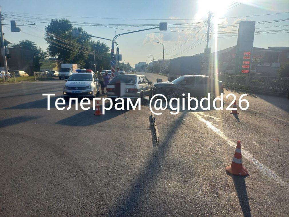 «По предварительным данным, сегодня, 25 июля в 16:15 на Старомарьевском шоссе водитель автомобиля Lada Priora выехал на регулируемый перекрёсток на запрещающий сигнал светофора, в результате чего допустил столкновение с автомобилем ВАЗ-2114, водитель которого совершал поворот налево», — сообщили в краевом управлении ГИБДД.