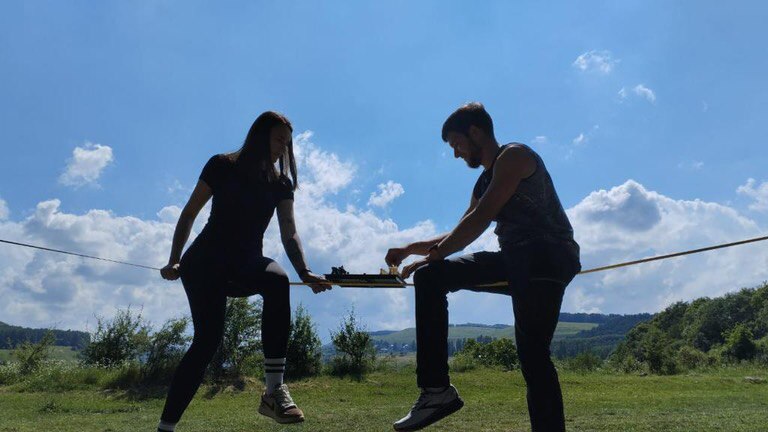 Ещё одна игра прошла в ущелье Берёзовской балки, где на натянутой стропе слэклайнеры должны были балансировать и при этом держать потерянные фигуры в руках.