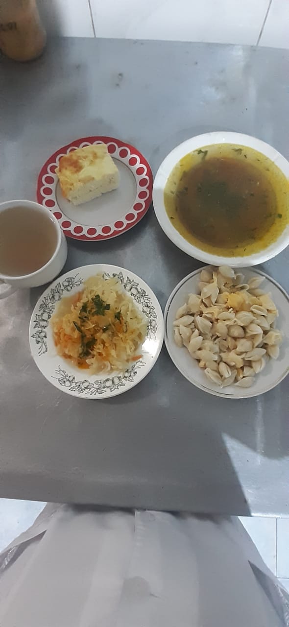 Судя по кадрам, на обед в Нефтекумской больнице были гречневый суп, макароны с сыром, капуста тушеная, омлет для щадящей диеты на второе и компот.