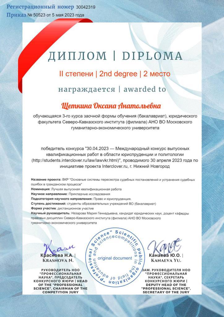 Так, обучающая юридического факультета заочной формы обучения Щеткина Оксана Анатольевна под руководством научного руководителя, кандидата юридических наук, доцента кафедры правовых дисциплин Назаровой Марии Геннадьевны приняла участие в Международном конкурсе выпускных квалификационных работ. По результатам конкурса Оксана Анатольевна заняла почетное 2 место в номинации «Лучшая выпускная квалификационная работа» и была награждена дипломом второй степени.