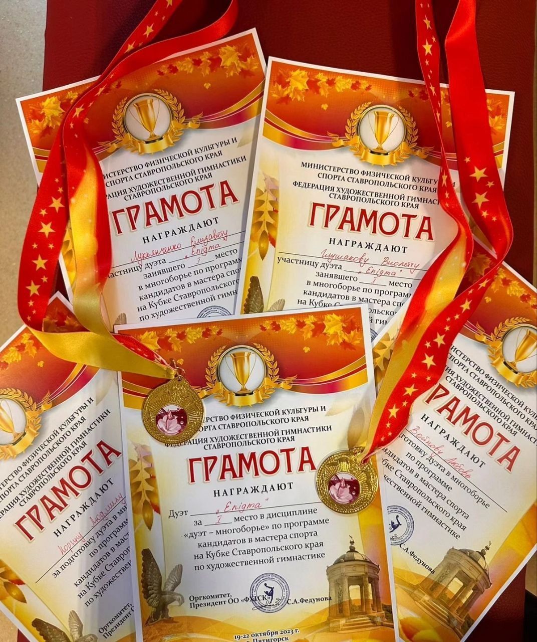 Борьба была очень упорной и сложной. По решению Министерства физической культуры и спорта и Федерации художественной гимнастики Ставрополья Лукьянченко Елизавета из Георгиевска и Глушакова Виолетта из Зеленокумска в составе дуэта Enigma заняли 1 место в дисциплине «дуэт - многоборье» по программе кандидатов в мастера спорта!