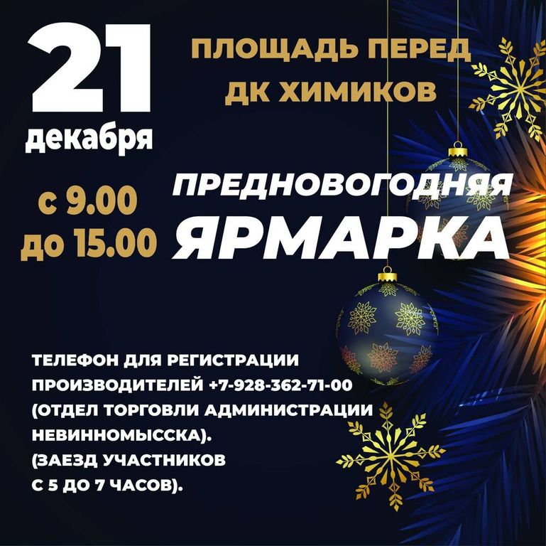 В субботу, 21 декабря, на площади перед ДК Химиков города Невинномысска состоится ежегодная продуктово-промышленная предновогодняя ярмарка.
