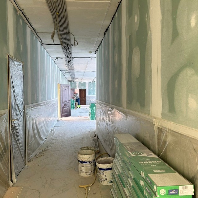 Работы ведутся без отставаний от графика. Произведена укладка напольного покрытия в рекреациях основного здания всех трех этажей. Продолжается отделка стен учебных кабинетов. Преображается фасад начальной школы.