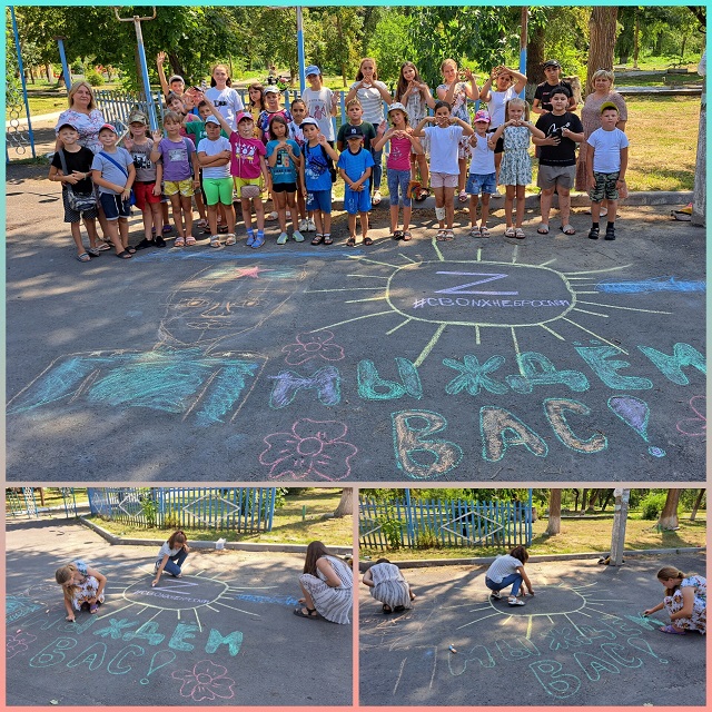 Мелками на асфальте они изобразили сюжет в поддержку российских воинов.