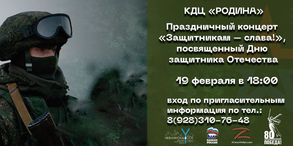 Концерт «Защитникам – слава» состоится 19 февраля в 18:00 в КДЦ «Родина». Подробности – в телеграм-канале главы города.