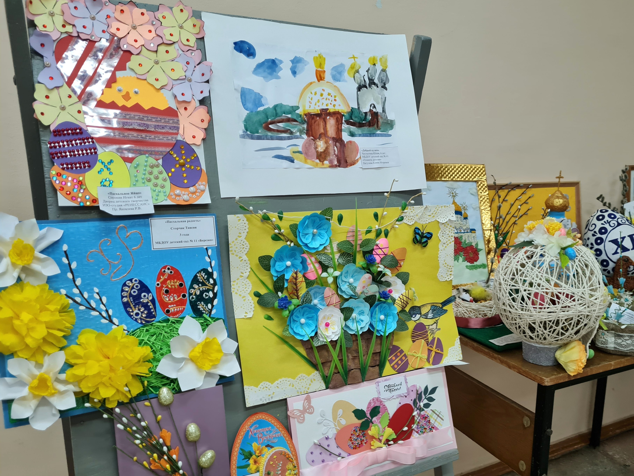 Индивидуальные и групповые работы разные по стилю и технике исполнения: рисунок, аппликация, вышивка, бисероплетение, вязание, тестопластика, валяние - все передают торжественность главного христианского праздника, весну и торжество жизни. Вся выставка поистине наполнена радостной и доброй атмосферой предстоящего праздника.